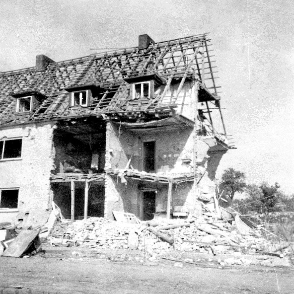 Von 1945 bis 1952 war in dem nicht zerstörten rechten Gebäude im Dachgeschoss links unsere Wohnung. Dort verbrachte ich meine ersten sieben Lebensjahre.